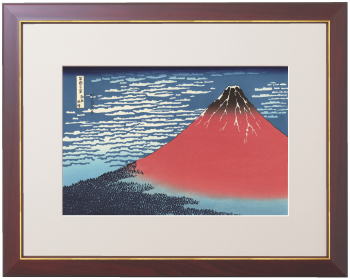 今や金運題材としてもてはやされる赤富士絵の先駆けとなった、斬新な構図が際だつ北斎芸術の極み。雄大な霊峰富士の美しい稜線を思い切ってデフォルメした、シンプルな線描と大胆な色彩で表現した逸品です。
