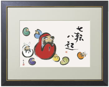 面壁九年の厳しい修行の末に悟りを開いたという達磨大師をモチーフに、「七転八起」の縁起の良い起き上がり達磨をユニークなタッチで描きました。転んでも何度でも起き上がる、元気と活力をあたえてくれる吉祥の名品です。